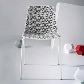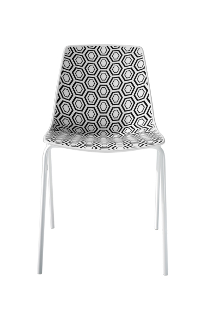 - L'assise de la chaise a un style géométrique en technopolymère noir sur fond blanc.