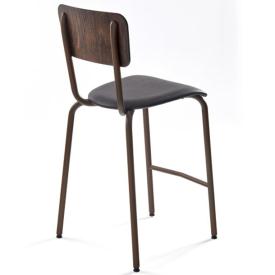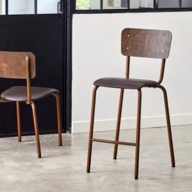 tabouret bas ALEX-Structure acier laqué rouillé (aspect Corten)- Assise écopelle marron-Dossier bois effet vintage