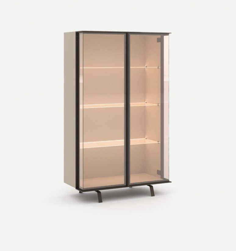 Buffet Piega / Structure de buffet en laque mate Titanio, portes en verre bronze avec cadre en aluminium, étagères en verre bronze. Piètement Tiglio en métal bruni.