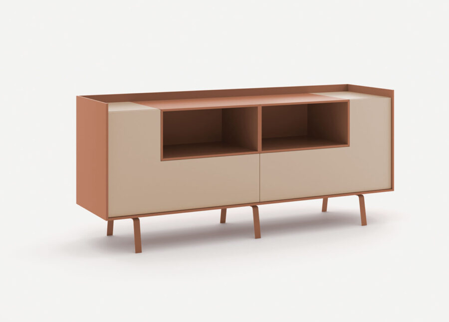 Douze panneaux de recouvrement épais entourent le buffet Tray, un meuble à forte personnalité grâce au mélange de finitions et de matériaux entre les panneaux de revêtement et les modules du buffet.