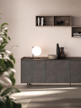 Douze panneaux de recouvrement épais entourent le buffet Tray, un meuble à forte personnalité grâce au mélange de finitions et de matériaux entre les panneaux de revêtement et les modules du buffet.