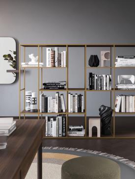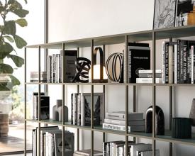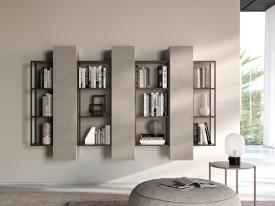 bibliothèque Grafic en finition laquée mate Titanio et étagères en finition laquée mate Artico / finition laquée mate et étagères en finition laquée mate Artico / finition laquée mate et étagères en finition laquée mate Terra / Bibliothèque double face Grafic en finition laquée métallique Cumino et étagères en matériau Cotto.