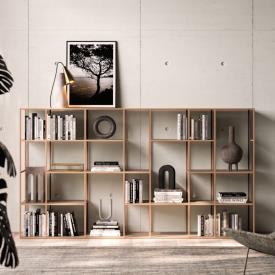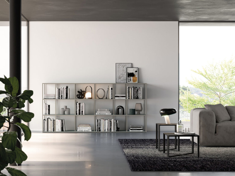 La bibliothèque Grafic, avec sa structure métallique de 15 x 15 mm, présente un cadre laqué mat et des étagères et fonds disponibles dans toutes les finitions. Elle offre une grande liberté de composition et une vaste palette de couleurs.