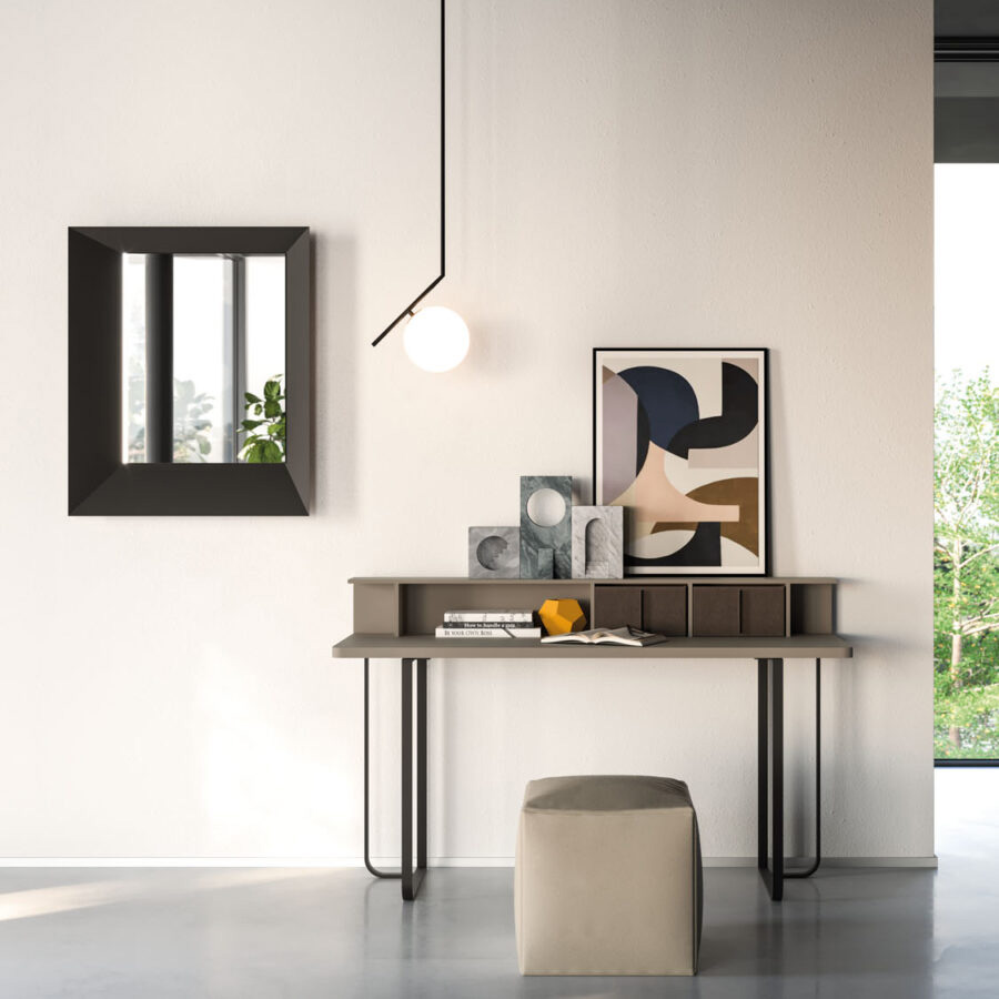 Un bureau élégant et pratique, avec une structure et un plateau en métal dotés d'une crédence et agrémentés de tiroirs en cuir. Un espace intime pour écrire et méditer.