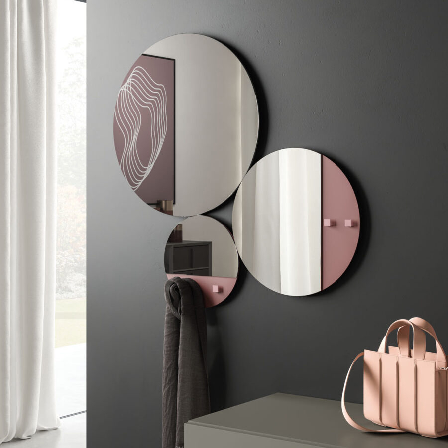 Trois cercles de diamètres différents, assemblés, forment une composition élégante et décorative. Un insert métallique, dans les finitions laquées, permet au miroir Lime de se fixer au mur, en plus de sa fonction miroir.