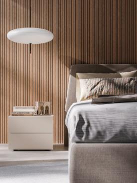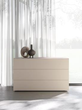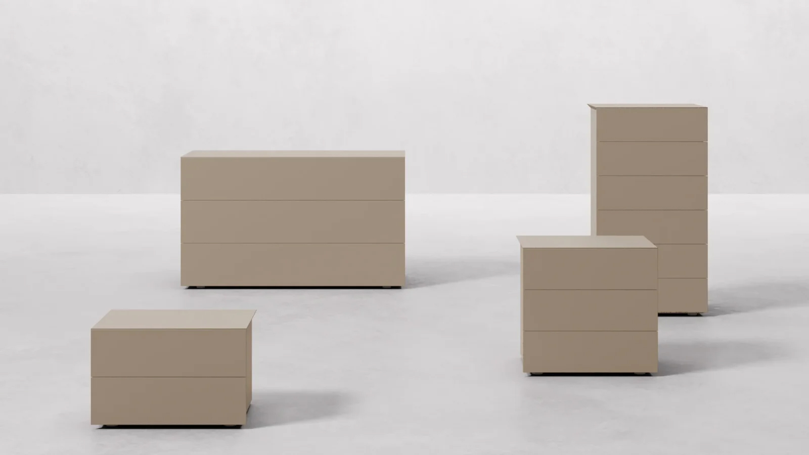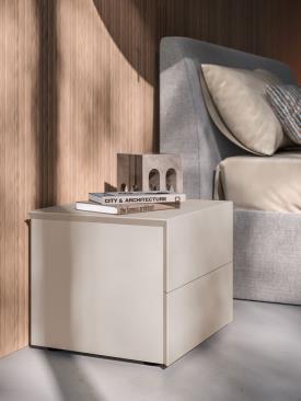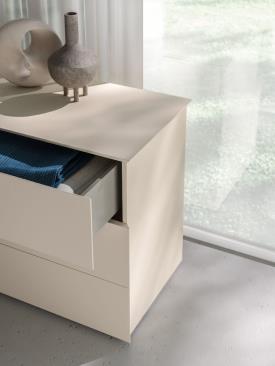 La collection Clip se distingue par la finition à 45 degrés de ses plateaux et façades, facilitant l'ouverture latérale des tiroirs. Des tables de chevet de différentes largeurs et hauteurs, ainsi que des commodes et des chiffonniers sont disponibles.