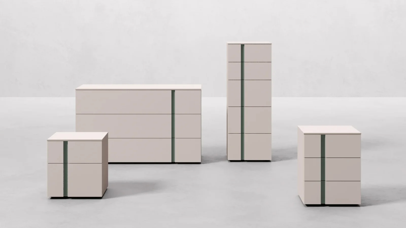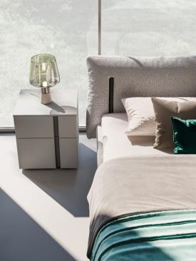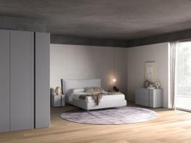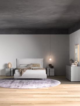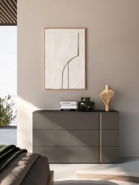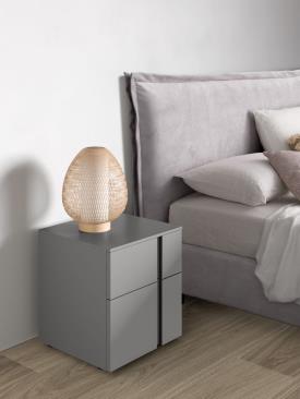 Tables de chevet et commode Aries en finition laque mate Titanio avec poignées laquées mates Tufo.
