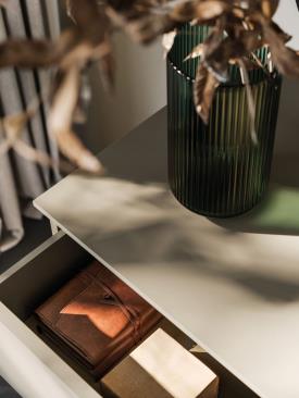 table de chevet et commode Aries en finition laquée mate anthracite et poignée en métal laqué Palladio