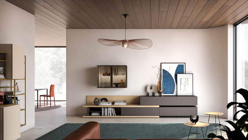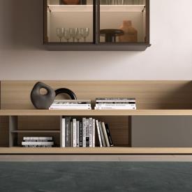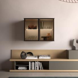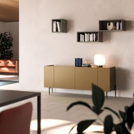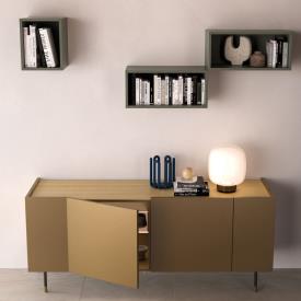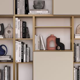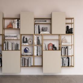Bibliothèque murale Grafic en finition métal laqué Cumino et meubles muraux Compongo en finition laquée mate Sabbia.