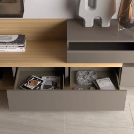 Meubles Modulo sur pied et muraux, finition laque mate anthracite, avec tiroirs ouverts.