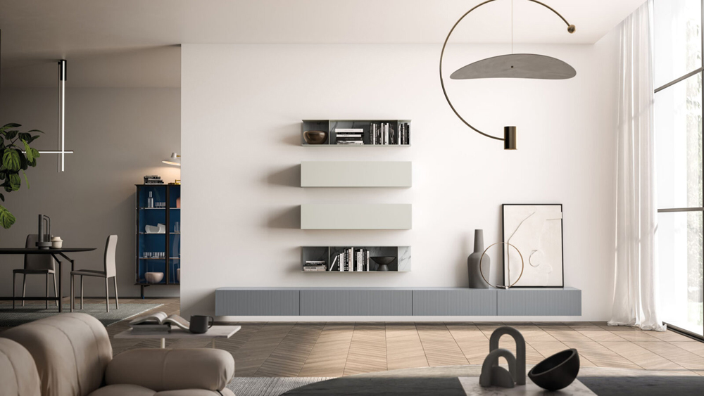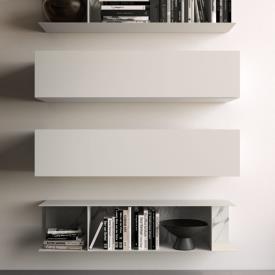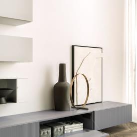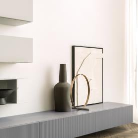 Base suspendue Modulo avec portes à rabat en finition laque mate Basalto Linea et mécanisme d'ouverture Filo.