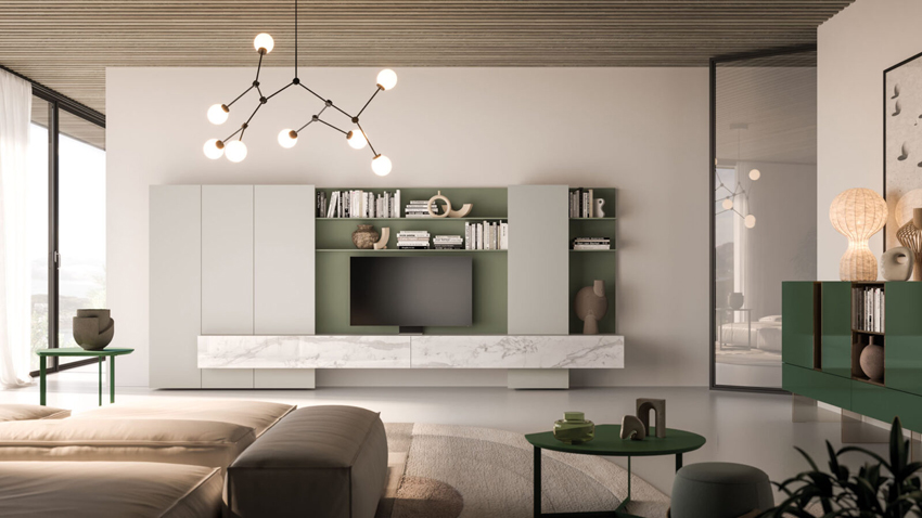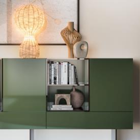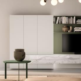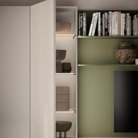 Meubles muraux Sipario en laque mate Perla avec éclairage LED vertical et étagères en verre rétroéclairées.