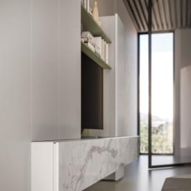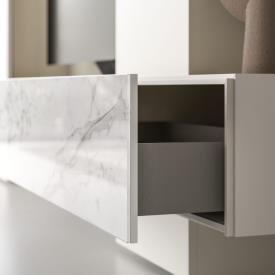 Meuble à tiroirs Compongo avec façade en verre imprimé Calacatta Gold.