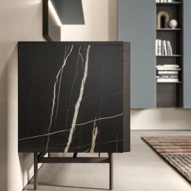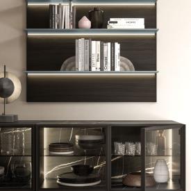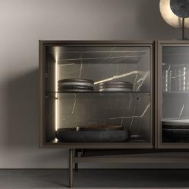 Buffet vitré en mélaminé effet marbre Tunisi, avec portes vitrées transparentes et éclairage intégré. Boiseries horizontales en finition Carbone et étagères en laque mate Nebbia.