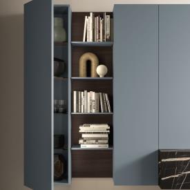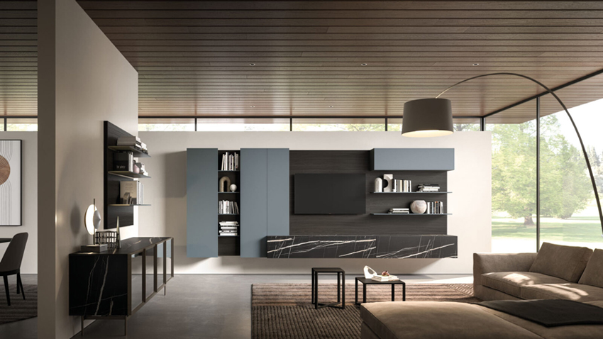 Meubles muraux Sipario en finition laque mate Nebbia et meubles bas suspendus Modulo en finition mélaminée marbre Tunisi.