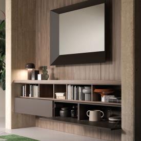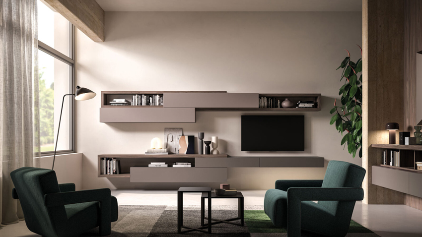 Étagères Snake d'une épaisseur de 50 mm avec finition Noce, éléments bas suspendus Modulo avec finition laquée mate Argilla et éléments muraux Modulo avec finition laquée mate Ortensia.