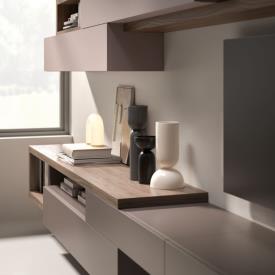 Éléments muraux Modulo en finition laquée mate Argilla, éléments muraux Air en finition Noce et plan de travail de 50 mm d'épaisseur en finition Noce.