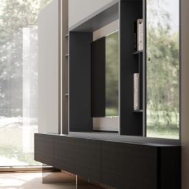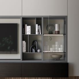 Élément TV Urbe en finition laquée mate Basalto et Piuma avec Raster et porte vitrée.