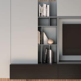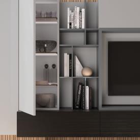 Meubles muraux Sipario en finition laquée mate Piuma et Raster en finition laquée mate Basalto.