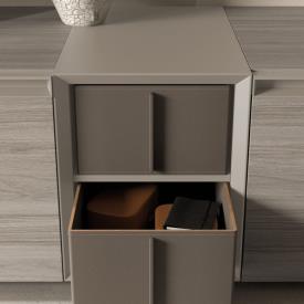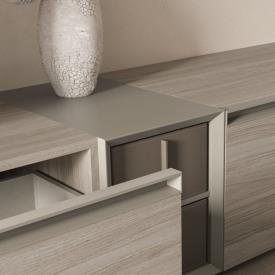 Meubles sur pied Modulo finition Ossidato avec poignée Gola finition laque mate Titanio, meuble Strema finition laque mate Titanio avec tiroirs en cuir Antracite.