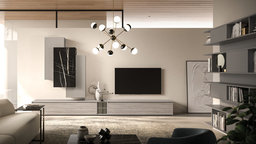 Meubles muraux Elle en finition laque mate Titanio et meuble mural Modulo en finition mélaminée Tunisi.