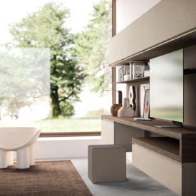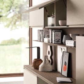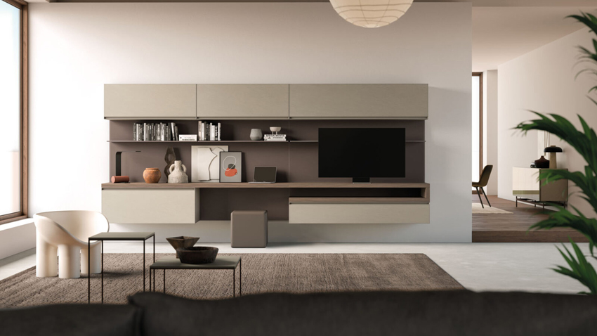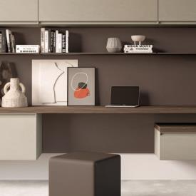 Éléments muraux en mélaminé finition Dekor Avana et poignée Gola. Boiseries horizontales finition Dekor Bronzo, console en mélaminé finition Noce.