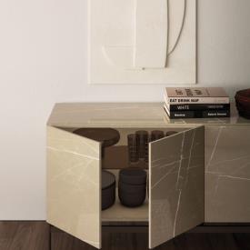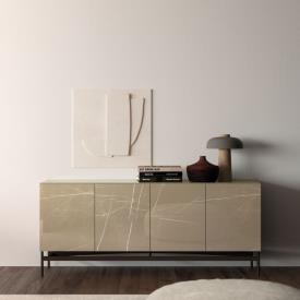 Buffet Vitro finition Avana dekor avec portes et plateau en verre imprimé Amani, piètement Dalia en métal bruni.