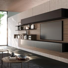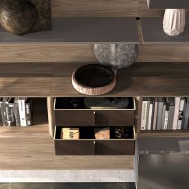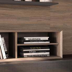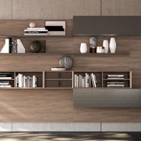 Boiseries horizontales en finition Noce avec étagères en laque mate Tufo, éléments Strema en placage Noce. Éléments muraux Modulo avec portes en métal laqué brossé Argento.