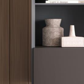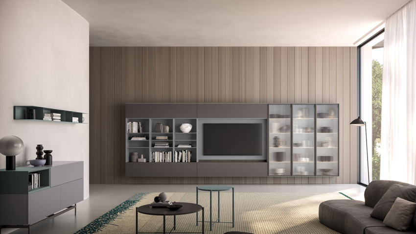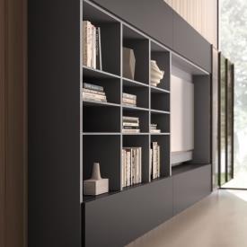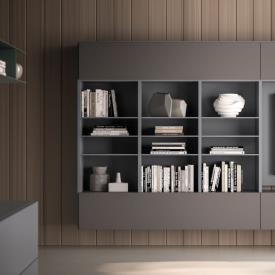 Bibliothèque suspendue en finition laque mate Basalto avec portes en finition laque mate Tufo, éléments bas suspendus Modulo en finition laque mate Tufo.