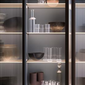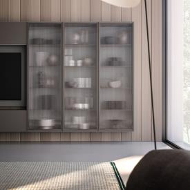 Bibliothèque suspendue en laque mate Basalto avec portes vitrées en verre Canneté et cadre en métal bruni.