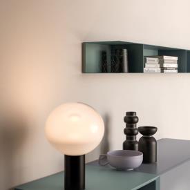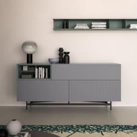 Buffet Modulo en laque mate Basalto avec façades Linea. Élément Strema en laque mate Artico, piètement Dalia en métal bruni avec détails laqués mats Artico. Meubles muraux Air en laque mate Artico.