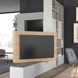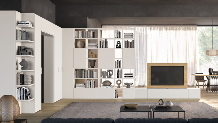 Bibliothèque en laque mate Perla avec meuble TV pivotant en finition métal Rovere.