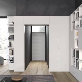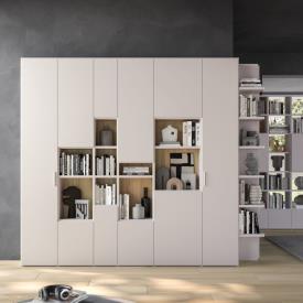 Bibliothèque en laque mate Perla et finition Rovere avec portes à charnières et compartiments ouverts.
