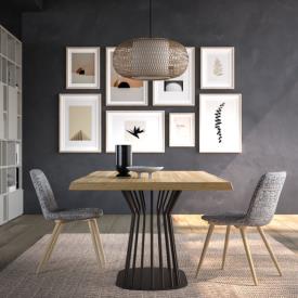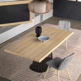 Table Sambuco avec plateau écorcé finition Rovere et piètement en métal bruni. Chaise Gemma avec piètement en bois massif teinté Rovere et assise en tissu.