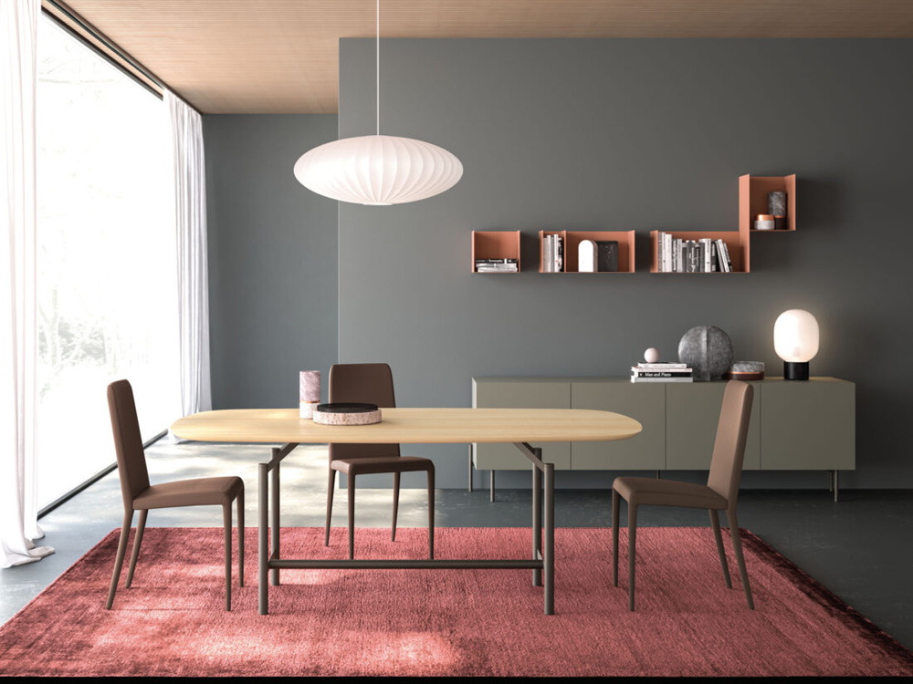 Salle à manger avec table Brando en bois massif Rovere et piètement en métal bruni.