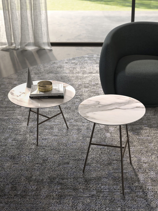 Tables basses Glicine en laque mate Perla et verre imprimé Calacatta avec piètement en métal bruni
