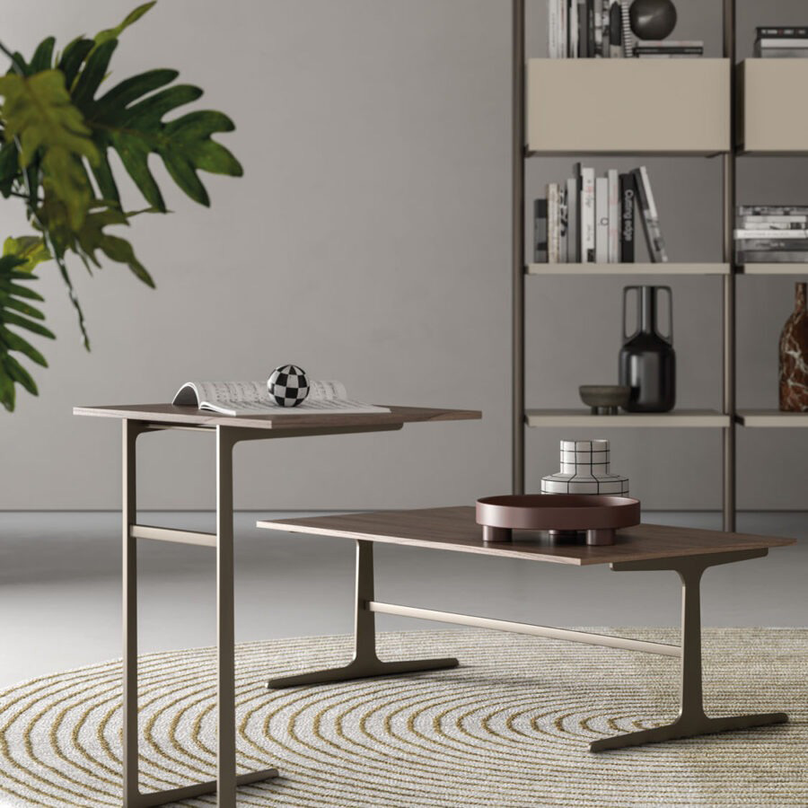 une table basse avec une finition en matériau Noce et un piètement en métal bruni.