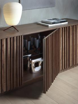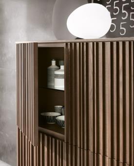 Line est un meuble de rangement extrêmement polyvalent, dont le design emblématique est rendu possible par ses portes en bois finement travaillées. Selon la configuration, il peut se transformer en armoire à deux, trois ou quatre portes, en buffet haut ou en meuble TV. Buffet et armoire avec structure plaquée et en frêne massif. Plateau plaqué. Étagères intérieures en verre transparent.