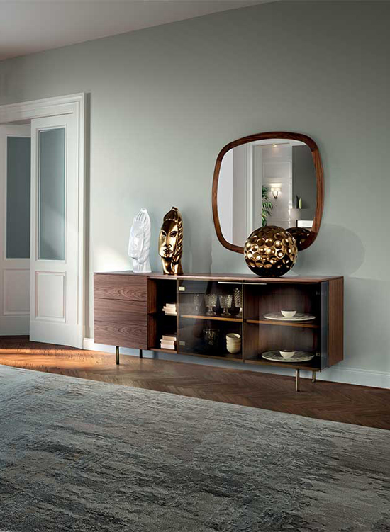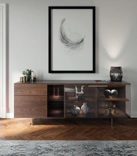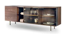 La structure en noyer Canaletto repose délicatement sur un piètement en métal peint laiton, associé à des poignées, les tiroirs qui protègent nos affaires des regards indiscrets, le compartiment ouvert et les étagères qui mettent en valeur nos objets préférés : le tout dans un mélange harmonieux rappelant les armoires d'antan, revisitées avec modernité et élégance. La charnière spéciale à ouverture d'angle apporte une touche d'élégance, surprenante et faisant de STAR la pièce maîtresse du salon. Buffet avec structure plaquée en noyer Canaletto. Tiroirs, compartiment ouvert avec étagère en verre et compartiment fermé avec étagères en bois plaqué noyer Canaletto. Portes vitrées. Porte droite avec ouverture d'angle spéciale. Poignée et piètement en métal peints couleur laiton.