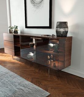 Un buffet au design moderne qui attire tous les regards, un chef-d'œuvre d'équilibre entre la transparence du verre et la chaleur du bois