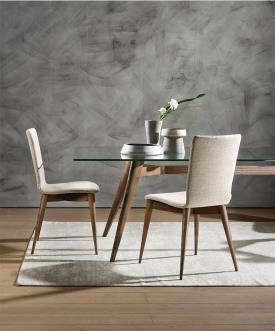 Chaise avec structure en frêne massif, coque courbée recouverte de cuir, éco-cuir ou tissu de la collection.