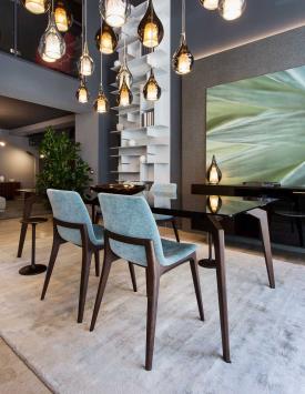Chaise de salle à manger raffinée au design contemporain. Avec ou sans accoudoirs, elle est également disponible en version tabouret, idéale pour les projets professionnels.