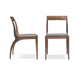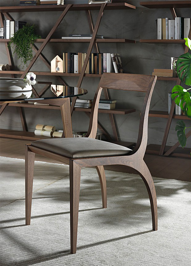 Les lignes douces des pieds arrière, qui se prolongent dans la courbe du dossier, font de Thelma une chaise unique en son genre, mettant en valeur le raffinement de la fabrication et la beauté du noyer Canaletto. L'étude minutieuse des géométries est sublimée par la version avec accoudoirs. Chaise avec structure en noyer Canaletto massif, assise revêtue de cuir, de similicuir ou de tissu de la collection.