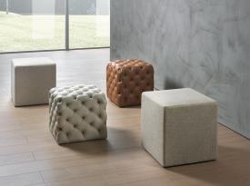 Pouf en cuir, similicuir ou tissu, également disponible en version capitonnée. Un pouf cubique pratique et élégant.