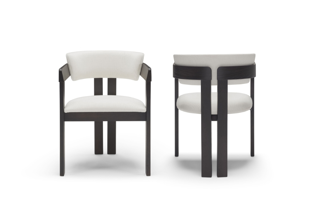 Chaise et fauteuil avec structure en frêne massif, assise et dossier recouverts de cuir, éco-cuir ou tissu de la collection.