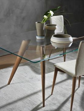 Les pieds coniques et élégamment fuselés de la table à manger Novecento lui confèrent un dynamisme fluide et une nette impression de légèreté visuelle. La structure longitudinale sophistiquée, en frêne massif comme les quatre pieds, crée un contraste raffiné avec le plateau. En frêne plaqué ou en verre trempé naturel, transparent, bronzé ou fumé, avec des plaques électrosoudées, le plateau épouse la structure sous-jacente avec une grande élégance, créant un produit d'une grande classe et d'un raffinement exquis.