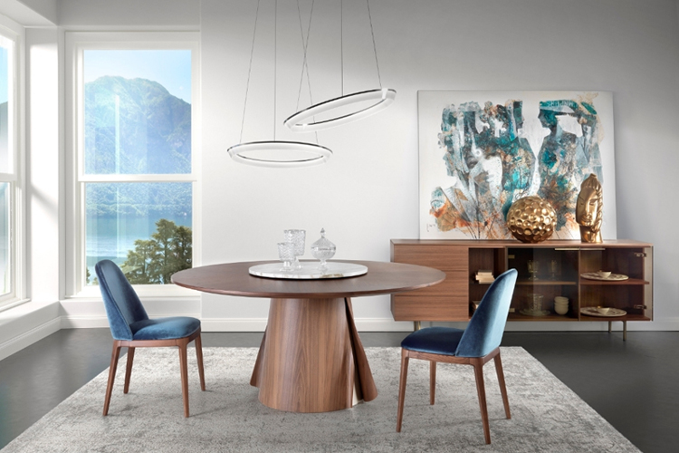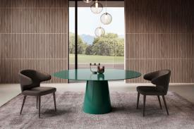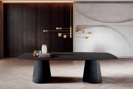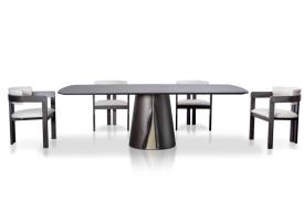 Imposante par ses proportions, sobre et viscéralement sculpturale grâce à sa structure typique d'une fonderie d'art, elle est à la fois une table à manger accueillante. Robuste et monumentale, la table Shell, avec son piètement en noyer Canaletto et ses finitions optionnelles avec ailettes et insert peint en bronze, attire tous les regards. Disponible en différentes formes et tailles, avec un ou deux piètements supportant des plateaux en bois ou en marbre, elle s'intègre parfaitement aux espaces où élégance, raffinement et solidité sont de mise. Table à manger avec piètement plaqué en noyer Canaletto et finitions peintes en bronze. Plateaux incurvés en bois plaqué noyer Canaletto. Plateau en bois ou en marbre naturel poli. Sur demande, plateau tournant Lazy Susan en verre laqué (blanc extra clair, noir, moka ou boue), en noyer Canaletto plaqué bois ou en marbre naturel poli.