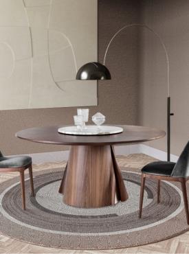 Une table à manger avec une base en bois et des plateaux en bois ou en marbre